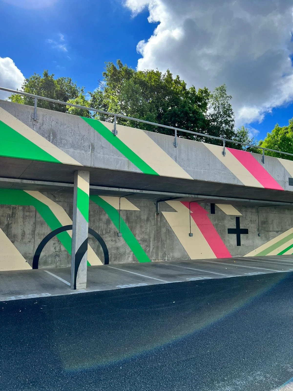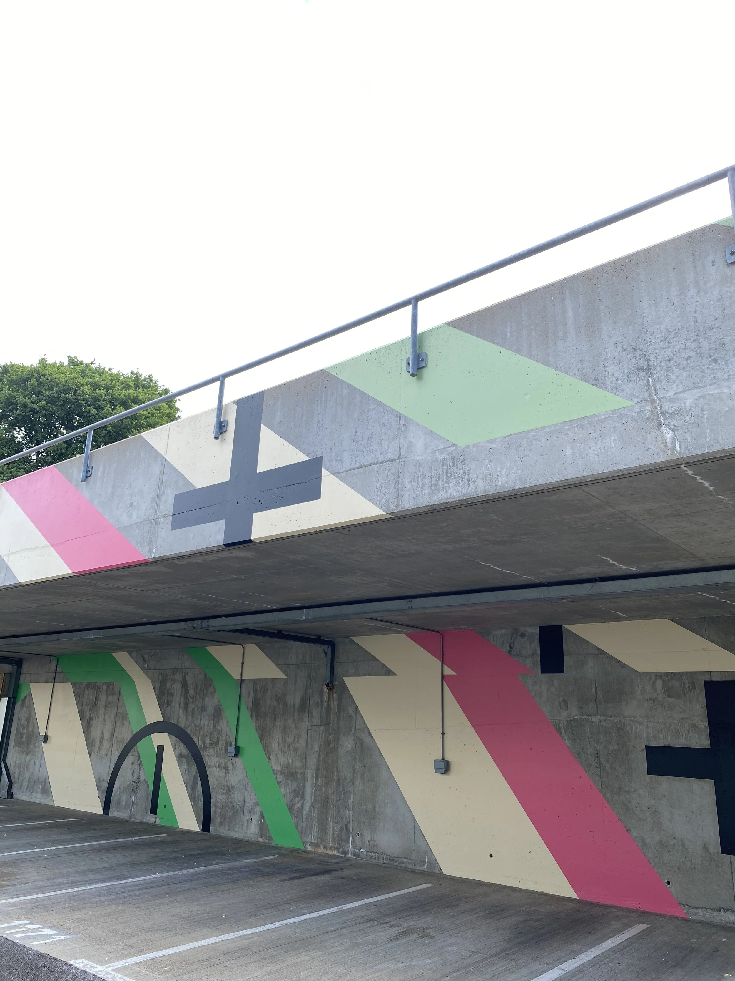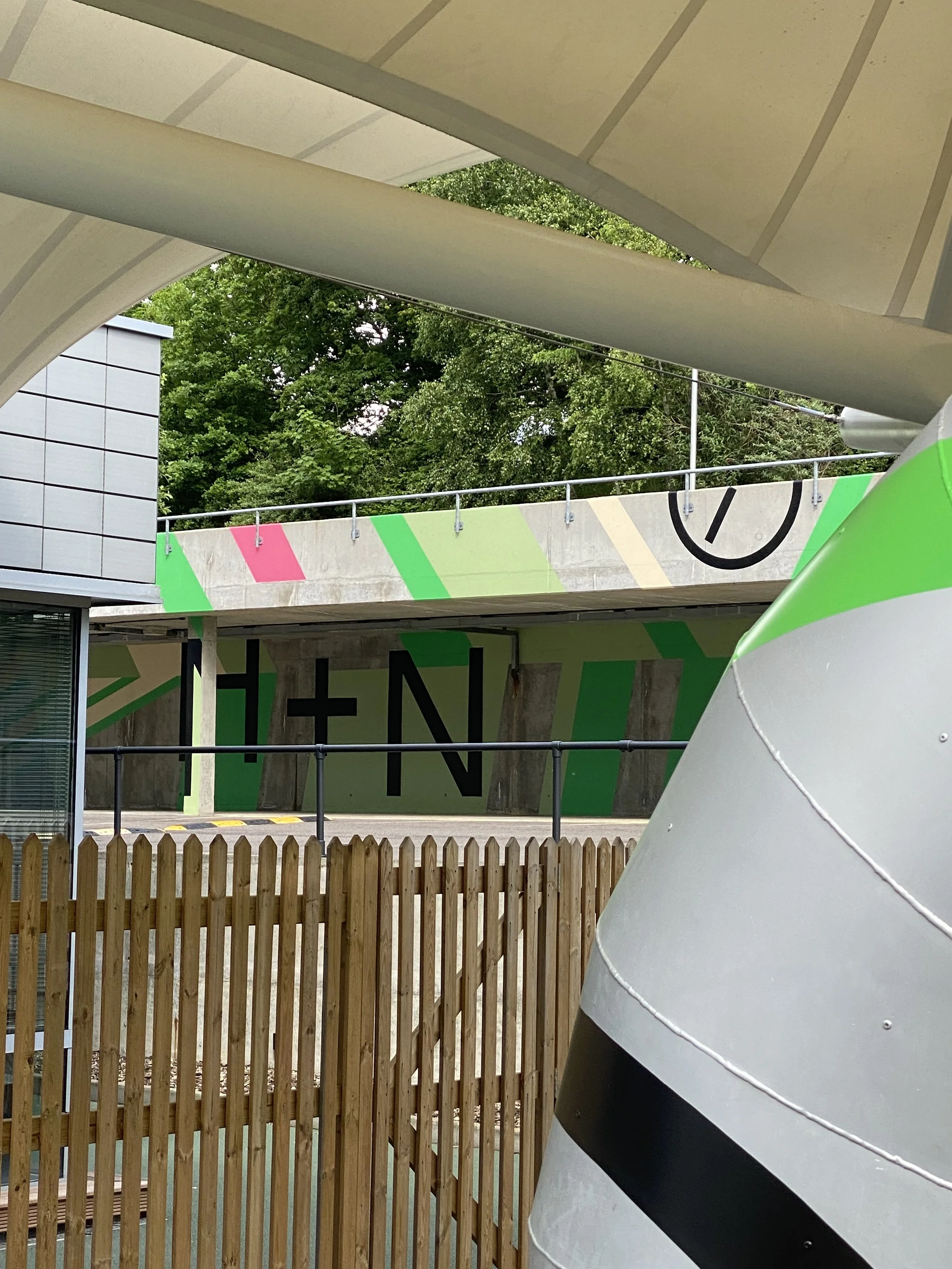 We were asked to design and paint an exterior concrete retaining wall for Here + Now, an office campus development in Thames Valley Business Park, Reading. At over 100 meters long and 6m high this is one of our largest exterior murals to date.