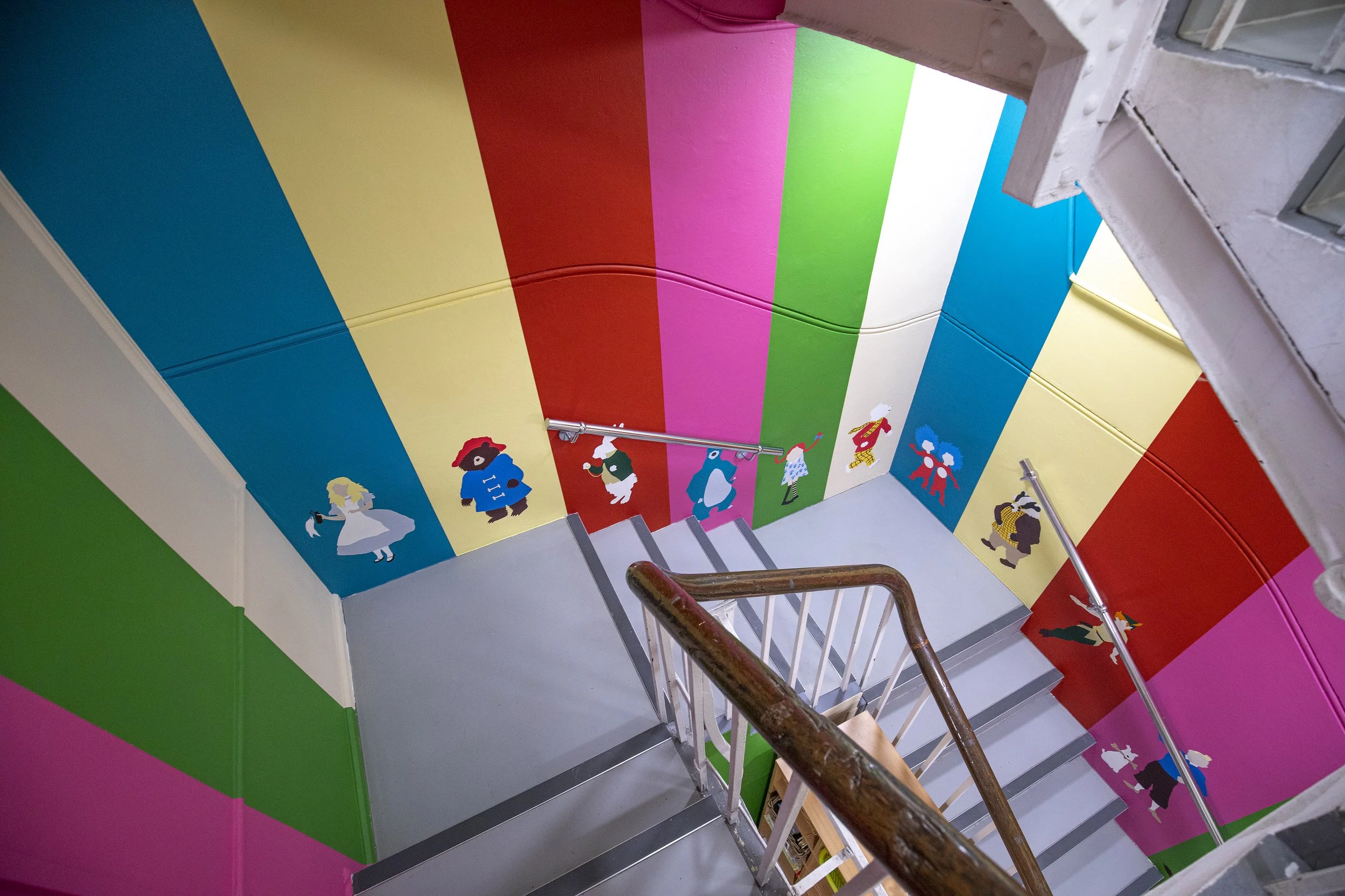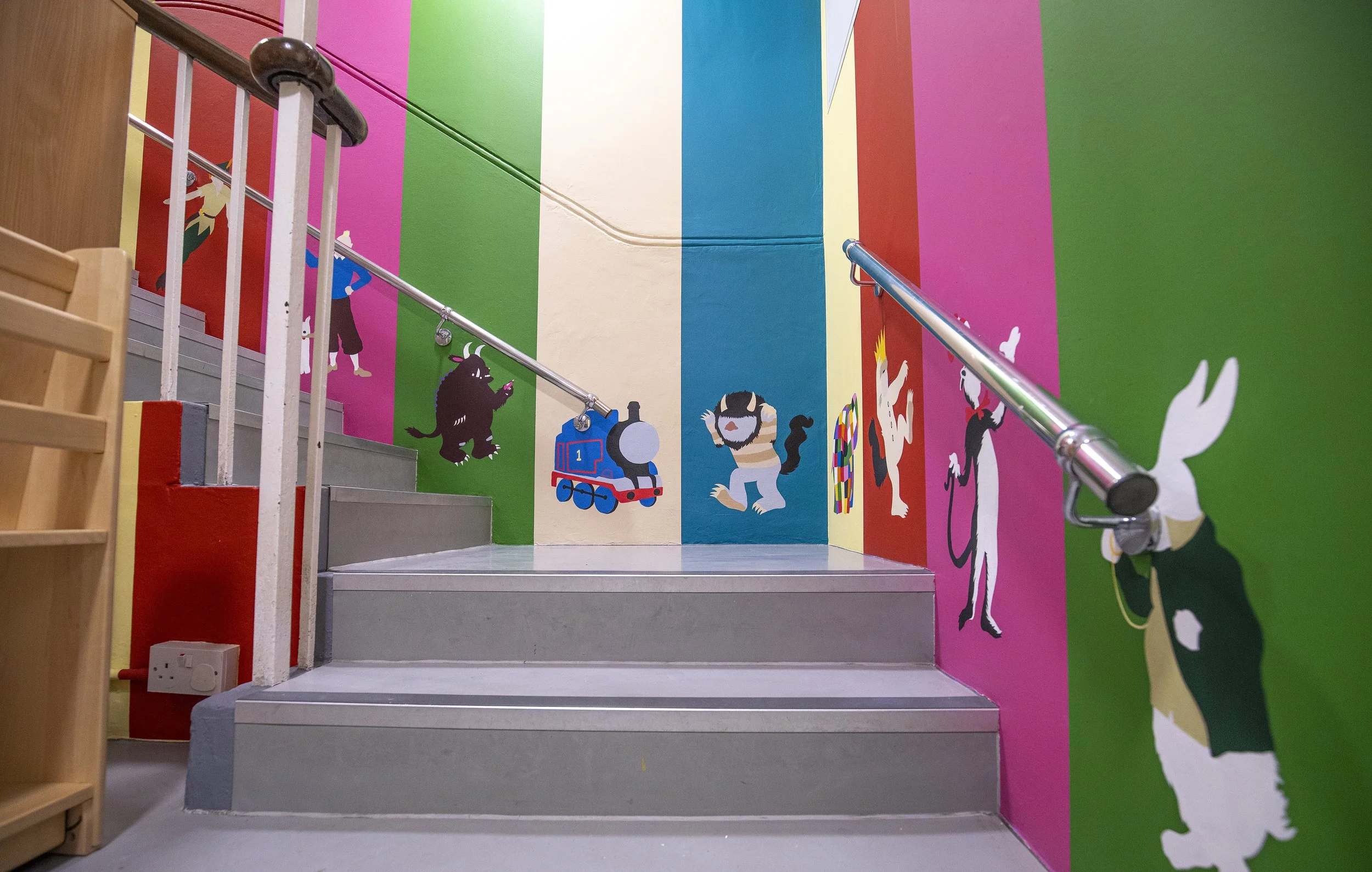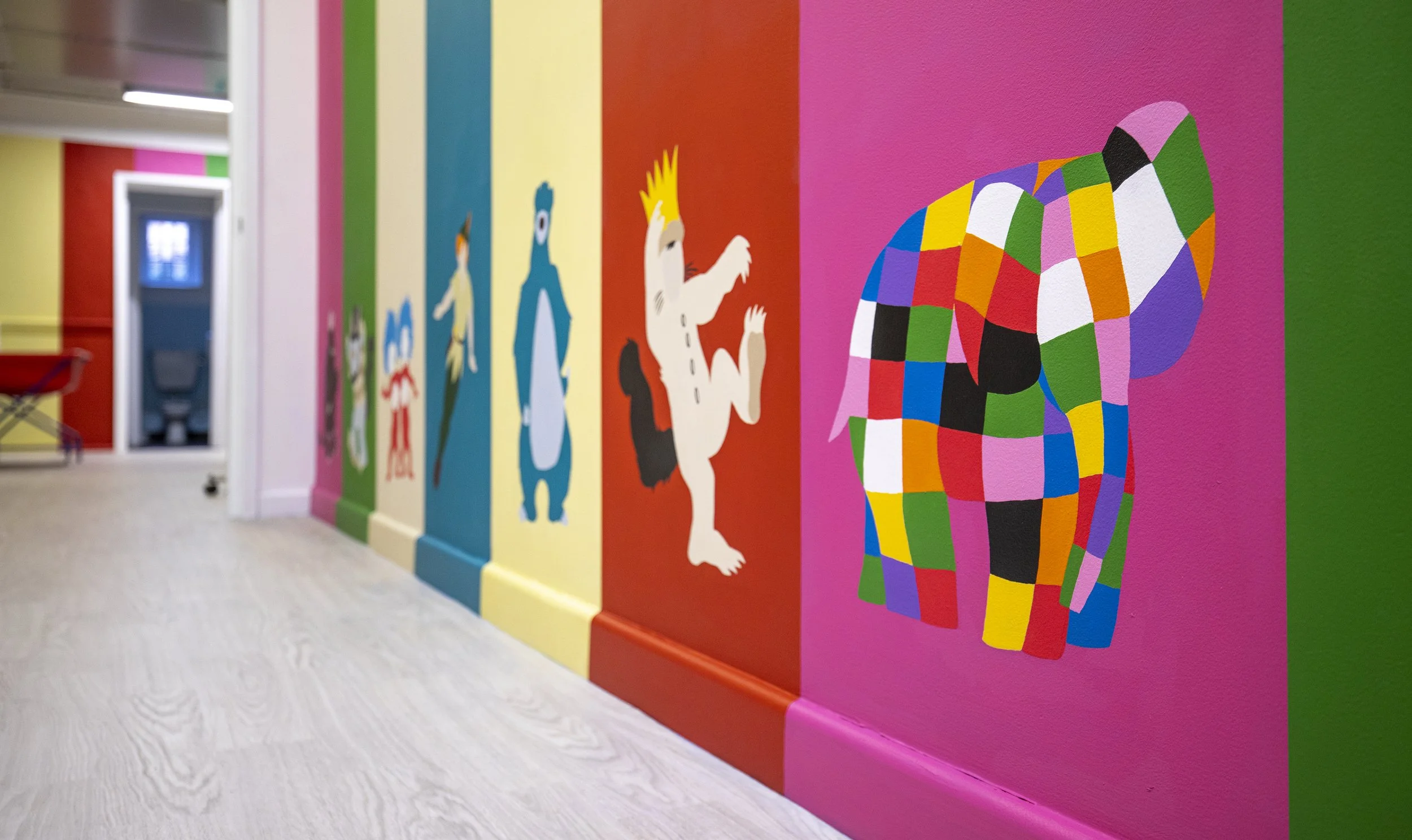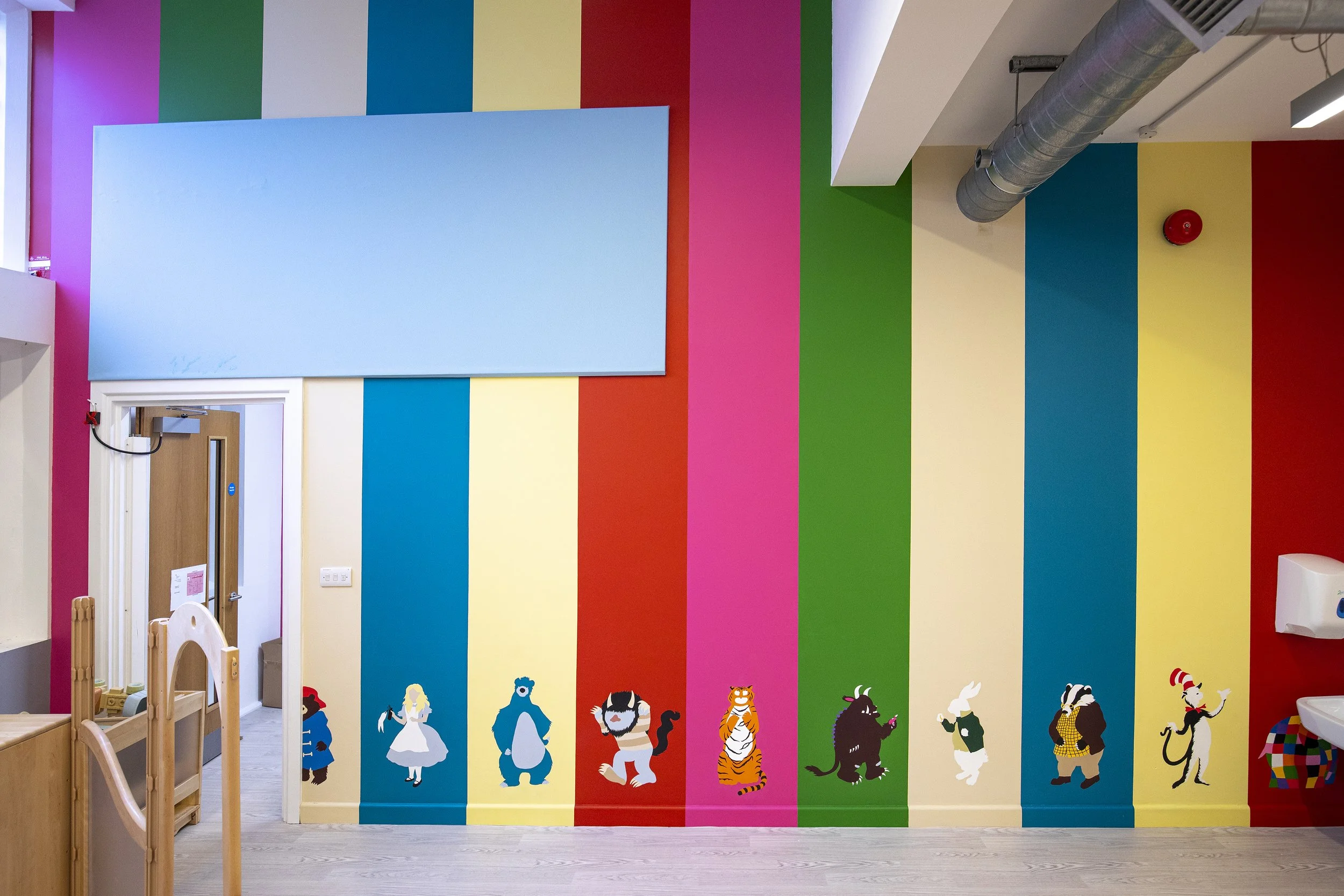 By using large colourful stripes we were able to maximise the sense of space and light throughout the space. We then added stylised characters from a range of classic and modern children’s books throughout the design - all while bearing in mind to keep the details of the mural closer with the children’s line of vision.