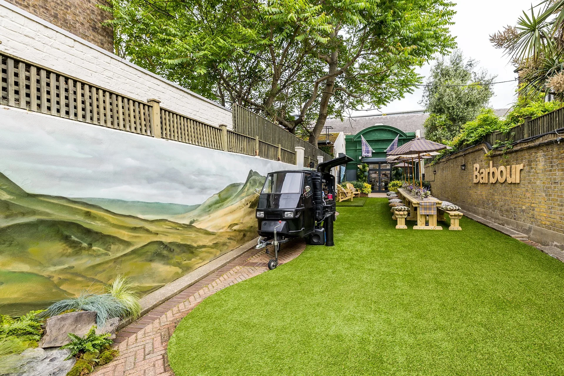 Working alongside Retail and Commercial Interior Design Consultancy Lucky Fox, the space at Barbour’s London HQ was transformed into a layered, immersive environment and one that balanced brand identity, seasonal warmth, and a strong sense of place. At the centre of it all sat a sweeping, hand-painted mural, grounding the experience in landscape and storytelling.